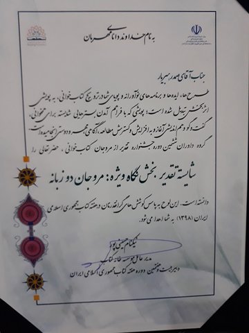 در این مراسم ویژه که با حضور مسئولان کشوری، نامزدان دریافت لوح تقدیر این جشنواره، فعالان حوزه فرهنگ کتاب و کتابخوانی، شخصیت های فرهنگی و اصحاب رسانه برگزار شد، صمد رهبریار، مسئول کتابخانه عمومی سیار قاصدک رشت با کسب بیشترین امتیاز به عنوان یکی از برگزیدگان بخش مروجان دوزبانه این جشنواره انتخاب و با اهدای لوح تقدیر این جشنواره از وی تجلیل شد.