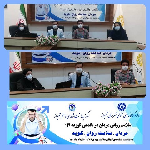 به مناسبت هفته بین المللی سلامت مردان نشست آموزشی «مردان، سلامت روان و کووید» روز یکشنبه ۳۰ خردادماه با همکاری مرکز بهداشت شهدای والفجر در شیراز برگزار شد. مسعود محمدی، کارشناس سلامت روان و مریم یارپزشکان، کارشناس سلامت میانسالان مرکز بهداشت شهدای والفجر سخنرانان این نشست بودند که درباره اهمیت سلامت روان در مردان، تفکر مردان و تاثیر آن بر سلامت جسم و روان، نقش خانواده در سلامت روان مردان، راه های ارتقا سلامت روان در مردان، مهم ترین عوامل ابتلا به کووید ۱۹ در مردان مطالبی را بیان کردند.