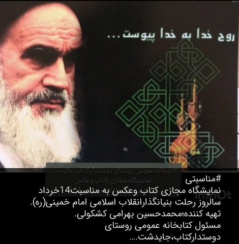 به مناسبت سالگرد ارتحال امام خمینی(ره) نمایشگاه «عصاره عصر» شامل ۳۸ عنوان کتاب در ۴۱جلد و همچنین ۷۳ قطعه عکس با موضوع رحلت جانگداز بنیانگذار کبیر انقلاب اسلامی در کتابخانه اباعبدالله حسین (ع) روستای دوستدار کتاب جایدشت فیروزآباد برگزار شد. این نمایشگاه از جمله فعالیت های فرهنگی کتابخانه روستا همچون معرفی متنی کتاب، جلسات مطالعاتی و همچنین فضاسازی کتابخانه در راستای گرامیداشت ایام ارتحال پیرِ جماران بود. در این برنامه علاوه بر به نمایش گذاشتن منابع موجود در مخزن کتابخانه، تعدادی از عکس های تأثیرگذار از حضور امام در صحنه های اجتماعی و انقلابی در معرض دید عموم گذاشته شده است.