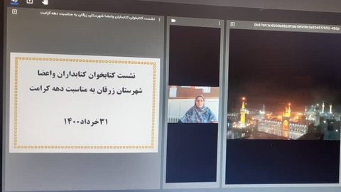 کتابداران و اعضای کتابخانه های عمومی این شهرستان به مناسبت دهه کرامت، روز دوشنبه ۳۱ خرداد نشست کتابخوان مجازی در بستر اسکای روم برگزار کردند. در این نشست فاطمه زارعی، مسئول کتابخانه امام سجاد مهربان(ع) کتاب «ماه هشتم؛ زندگینامه کوتاه و مستند امام رضا علیه السلام»؛ محمد حسین جعفری، عضو کتابخانه حافظ شهر لپویی قصه «مار و گنجشگ» از کتاب «ده قصه از امام رضا(ع)»؛ مسلم نوجوان، مسئول کتابخانه شهدای رحمت آباد کتاب «امام رضا(ع) و ایران» نوشته سید حسین حر؛ لیلا نعمت اللهی، مسئول کتابخانه استاد شهریار کتاب «بانوی ملکوت» و زهرا محمودی، کتابدار کتابخانه شهدای گمنام زرقان کتاب «میهمان توس» را معرفی کرد.