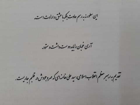 وی که پایان نامه‌ خود را به مقام معظم رهبری تقدیم کرده است، گفت: من ارادت ویژه‌ای به مقام معظم رهبری دارم و همواره از زمانی که شروع به حفظ قرآن کردم، آرزو داشتم به دیدار ایشان رفته و رهبر انقلاب را از نزدیک درک کنم. شعرهایی برای حضرت آقا در زمان‌های خاص سروده‌ام. در کنار ارادتم به مقام معظم رهبری، علاقه ایشان به شعر و تعمق و تسلط ایشان به نهج البلاغه نیز دلیل اهدای پایان نامه ام به ایشان بود.
