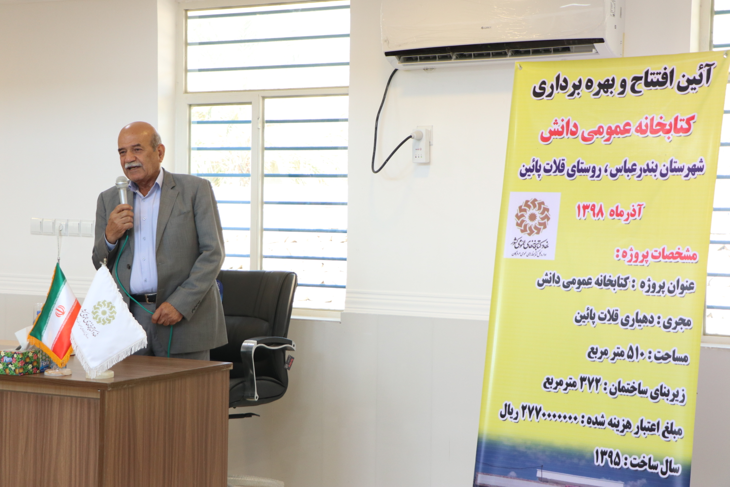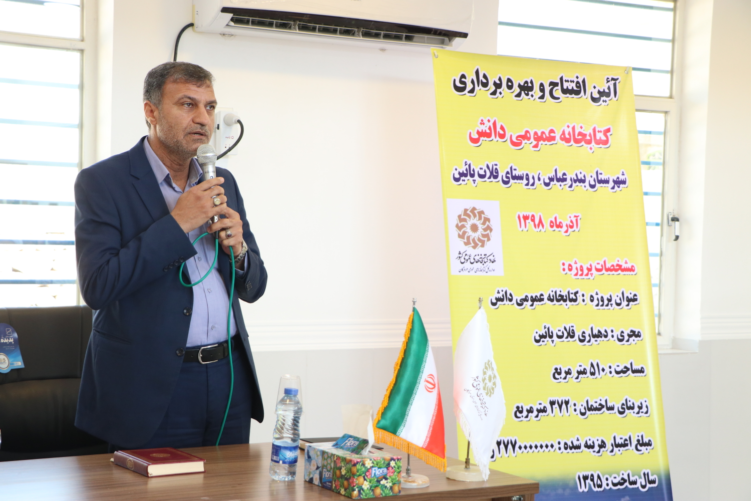 به گزارش روابط عمومی اداره کل کتابخانههای عمومی استان هرمزگان، آیین افتتاح کتابخانه عمومی دانش واقع در روستای قلات پایین شهرستان بندرعباس با حضور احمد مرادی، نماینده مردم هرمزگان در مجلس شورای اسلامی؛ حجت الاسلام و المسلمین محمد ذاکری، مدیرکل کتابخانههای عمومی استان هرمزگان؛ رضا کمالی، مدیرکل فرهنگ و ارشاد اسلامی هرمزگان؛ انوشیروان پیشدار، رئیس حوزه هنری استان هرمزگان؛ امیرحسین حیدری، سرپرست معاونت کتابخانههای عمومی استان هرمزگان؛ فضه عباس نژاد، سرپرست اداره کتابخانههای عمومی شهرستان بندرعباس؛ مجید سلحشور، مدیرکل دفتر امور روستایی و شوراهای استانداری هرمزگان، علاقه مندان به کتاب و کتابخوانی و اصحاب رسانه برگزار شد.