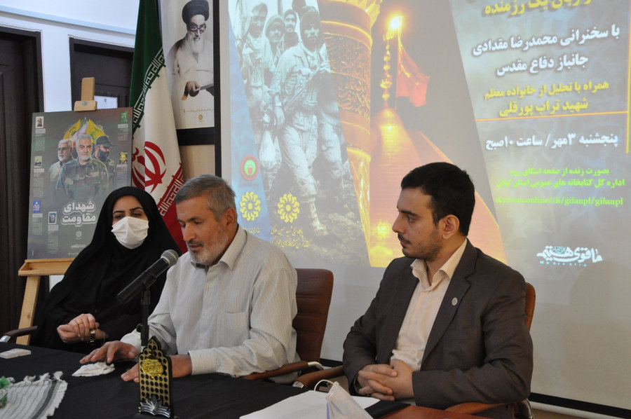به گزارش روابط عمومی اداره کل کتابخانه های عمومی استان گیلان، نشست مجازی روایتگری دفاع مقدس از زبان یک رزمنده روز پنجشنبه(۳ مهر) با حضور پریسا کرمی، مدیرکل کتابخانه های عمومی استان گیلان؛ محمدرضا مقدادی، رزمنده و جانباز جنگ هشت ساله؛ خانواده معظم شهید تراب پورقلی؛ زهرا بدن آرا، معاون امور کتابخانه ها و همکاری ها؛ مجتبی رمضانی، معاون اداری و مالی؛ جلال فردی مقدم، فرمانده پایگاه بسیج حسین املاکی(بسیج کتابداران کتابخانه های عمومی استان گیلان) و جمعی از مسئولان این اداره کل در سالن اجتماعات اداره کل کتابخانه های عمومی استان برگزار و از طریق فضای مجازی پخش شد.