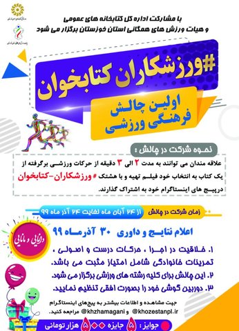 گفتنی است، چالش ورزشکاران کتابخوان از ۲۴ آبان ماه ۱۳۹۹ لغایت۲۴ آذر ماه سال جاری برگزار می شود. اسامی برگزیدگان ۳۰ آذرماه اعلام خواهد شد و به ۲۰ نفر از برگزیدگان این چالش، جوایزی به ارزش ۵ میلیون ریال تقدیم خواهد شد.