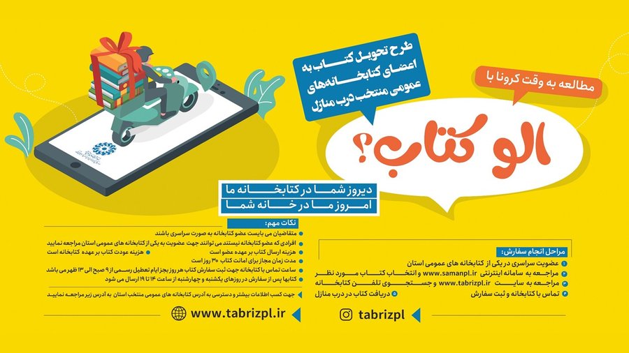 به گزارش روابط عمومی اداره کل کتابخانه های عمومی آذربایجان شرقی، با توجه به اپیدمی کرونا، طرح «الو کتاب» با هدف تسهیل دسترسی علاقمندان به کتاب در برخی از کتابخانه های عمومی آذربایجان شرقی اجرا می شود.