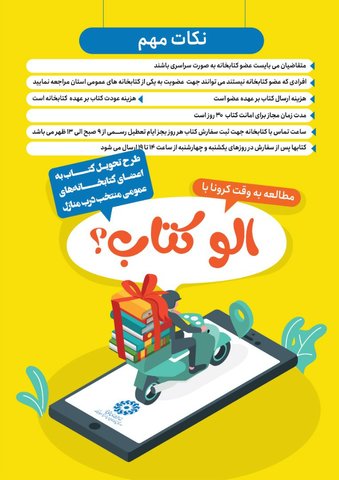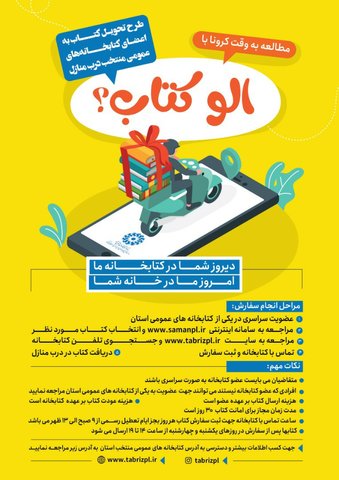 به گزارش روابط عمومی اداره کل کتابخانه های عمومی آذربایجان شرقی، با توجه به اپیدمی کرونا، طرح «الو کتاب» با هدف تسهیل دسترسی علاقمندان به کتاب در برخی از کتابخانه های عمومی آذربایجان شرقی اجرا می شود.