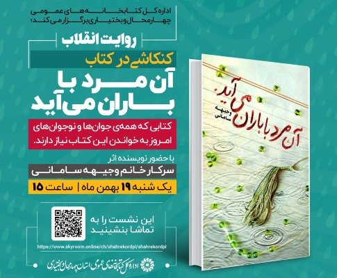 به گزارش روابط عمومی اداره کل کتابخانه های عمومی چهارمحال و بختیاری، همزمان با ایام الله دهه مبارک فجر نشست روایت انقلاب با موضوع نقد و بررسی کتاب «آن مرد با باران می آید» نوشته وجیهه سامانی با حضور نویسنده اثر، روز یکشنبه ۱۹ بهمن ماه ساعت ۱۵ برگزار می شود.