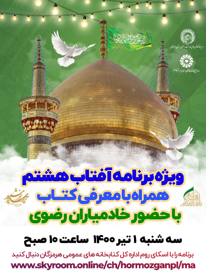 همزمان با ولادت امام رضا(ع) ویژه برنامه «آفتاب هشتم» با همکاری اداره کتابخانه های عمومی شهرستان بندرعباس و کانون کتاب و کتابخوانی استان هرمزگان در فضای مجازی برگزار شد.