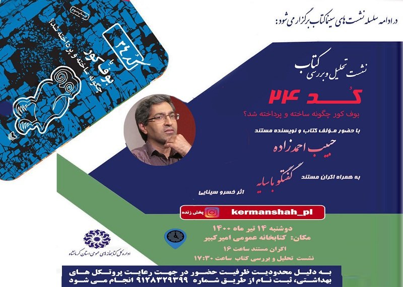 نشست تحلیل و بررسی کتاب «کد۲۴» با حضور حبیب احمدزاده، نویسنده اثر، به همت اداره کل کتابخانه های عمومی استان کرمانشاه برگزار می شود.