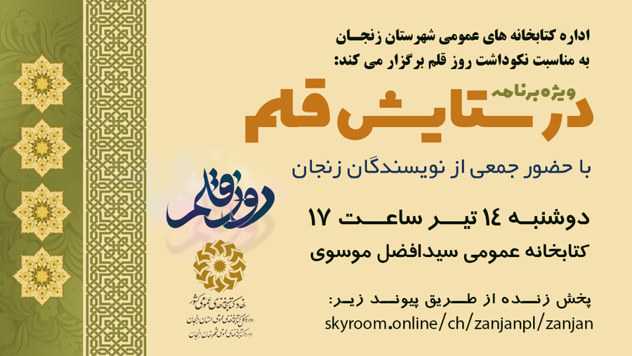 به گزارش روابط عمومی اداره کل کتابخانه های عمومی زنجان، «روز قلم» فرصتی است برای یادآوری منزلت و حرمت قلم و صاحبان آن که عمر خود را برای ارتقای فرهنگ و هنر این مرز و بوم در طبق اخلاص گذاشتهاند. به همین مناسبت ویژه برنامه ای با عنوان «درستایش قلم» با حضور جمعی از نویسندگان روز دوشنبه ۱۴ تیرماه ساعت ۱۷ در بستر اسکای روم برگزار میشود.