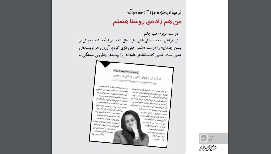 خانم کریمزاده من از داستان های شما لذت بردم و درس آموختم. از شما درخواست دارم درباره بچههای روستا هم داستان بنویسید. ما بچههای روستا واقعا از امکانات شهری بیبهره ماندهایم و خیلی از استعدادهایمان پایمال شده و میشود. در مورد محرومیت و مظلومیت نوجوانان روستا بنویسید تا کسانی که داستان میخوانند حداقل از زندگی آنان باخبر شوند و کمی اندیشه کنند. در روستا بچههای خوب و مهربانی با آرزوهای بلند و دل های به تمام معنا پاک و بیآلایش زندگی میکنند که شاید بزرگ ترین آرزویشان این باشد که حداقل یک سفر کوتاه داشته باشند که برای بچههای شهری یک موضوع پیش پا افتاده است. خانم مینو کریمزاده، از دل بچههای پاک نوجوان روستا، از کوچهباغهای روستا، از آرامش باغهای انگور روستای ما بنویسید که حتی خواندن این چنین جملهها گوش را مینوازد: با تشکر از شما»