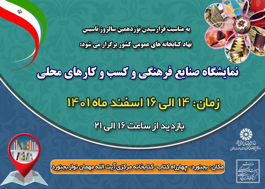 به گزارش روابط عمومی اداره کل کتابخانههای عمومی خراسان شمالی، نمایشگاه صنایع فرهنگی و کسب و کارهای محلی با مشارکت اداره کل میراث فرهنگی، صنایع دستی و گردشگری استان به مناسبت فرارسیدن ١٧ اسفندماه، نوزدهمین سالروز تاسیس نهاد کتابخانه های عمومی کشور در بجنورد برگزار میشود.