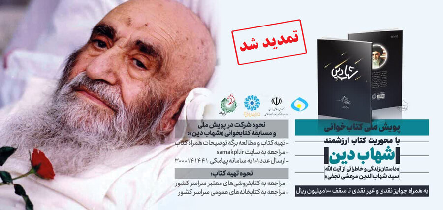 به گزارش روابط عمومی اداره کل کتابخانه های عمومی استان قم، با توجه به پیگیریهای صورت گرفته از سوی متقاضیان مبنی بر درخواست تمدید مدت زمان شرکت در پویش ملی کتابخوانی از کتاب «شهاب دین»، مهلت ثبت نام و شرکت در این مسابقه کتابخوانی تا۳۰ اردیبهشت ماه ۱۴۰۲ تمدید شد.