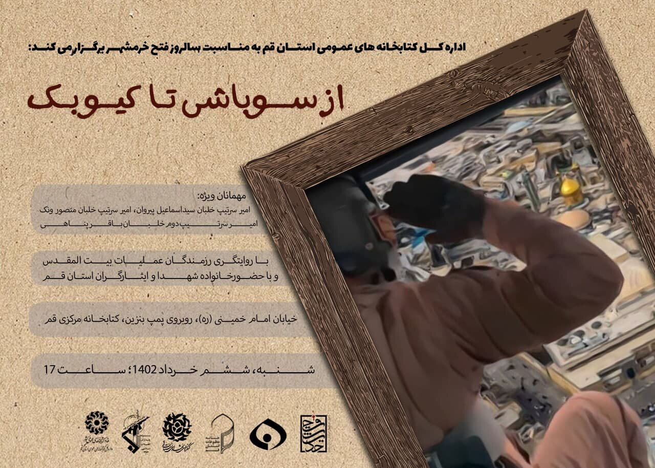 به گزارش روابط عمومی اداره کل کتابخانه های عمومی استان قم، به مناسبت سوم خرداد ماه، سالروز آزادسازی خرمشهر و همزمان با دهه کرامت، نشست روایتگری «از سوباشی تا کیووان» به میزبانی اداره کل کتابخانه‌های عمومی و با همکاری کنگره ملی شهدای استان، سپاه ۱۷ علی بن ابی طالب (ع) استان، کانون فرهنگی تبلیغی حدیث فتح و خانه مطبوعات استان قم، روز شنبه ۶ خرداد ماه ۱۴۰۲، ساعت ۱۷ در کتابخانه مرکزی قم (واقع در خیابان امام خمینی (ره)، رو به روی پمپ بنزین») برگزار خواهد شد.