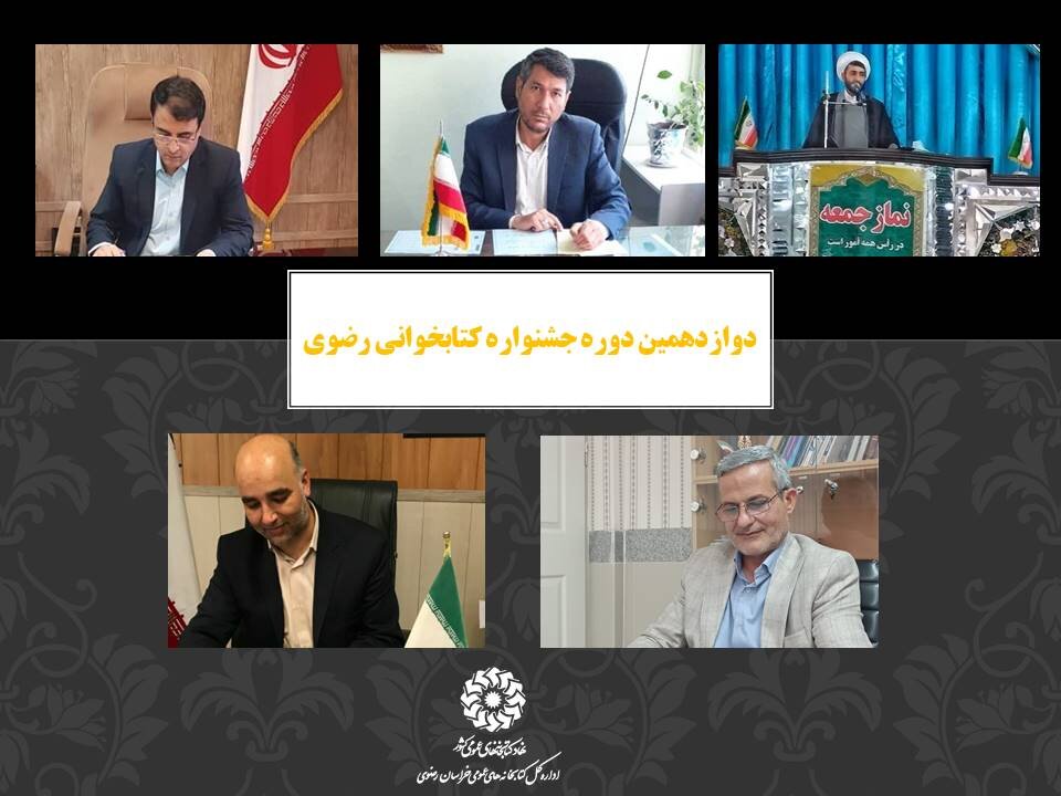 به گزارش روابط عمومی اداره کل کتابخانههای عمومی خراسان رضوی، فرماندار بجستان، امام جمعه و فرماندار خوشاب، رئیس اداره آموزش و پرورش مه ولات و رئیس اداره کل آموزش و پرورش استثنایی خراسان رضوی به منظور ترویج فرهنگ و سیره رضوی با صدور پیامی از عموم مردم برای مشارکت در برگزاری جشنواره کتابخوانی رضوی دعوت کردند.