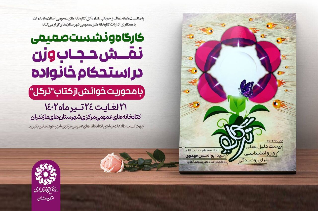 ادارهکل کتابخانههای عمومی مازندران به مناسبت هفتهی عفاف و حجاب، کارگاه آموزشی و نشست صمیمی نقش حجاب و زن در استحکام خانواده را با محوریت خوانش کتاب «ترگل» در کتابخانههای عمومی مرکزی شهرستانهای استان برگزار میکند.