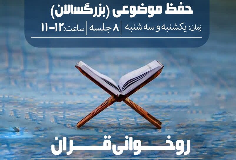 دوره آموزشی حفظ موضوعی قرآن کریم در هشت جلسه و در روز های یکشنبه و سه شنبه، ساعت ۱۰ الی ۱۱ ویژه کودکان و نوجوانان و ساعت ۱۱ الی ۱۲ ویژه بزرگسالان برگزار خواهد شد.