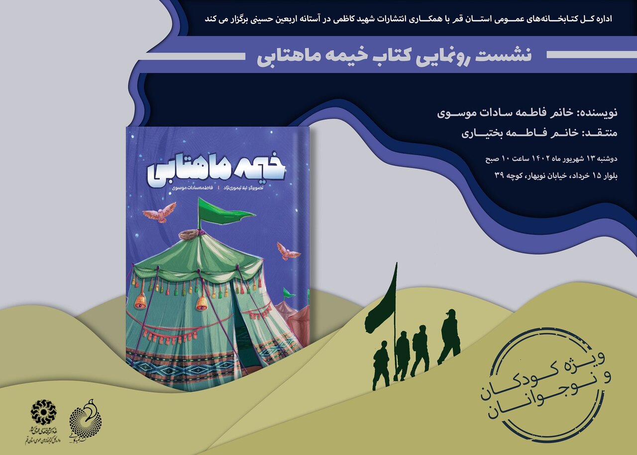 به گزارش روابط عمومی اداره کل کتابخانه های عمومی استان قم، به همت اداره کل کتابخانه‌های عمومی استان قم و با همکاری انتشارات شهید کاظمی در آستانه اربعین حسینی، نشست رونمایی کتاب «خیمه ماهتابی» با حضور فاطمه سادات موسوی، نویسنده اثر و فاطمه بختیاری، نویسنده کودک و نوجوان و منتقد ویژه کودکان و نوجوانان برگزار خواهد شد.