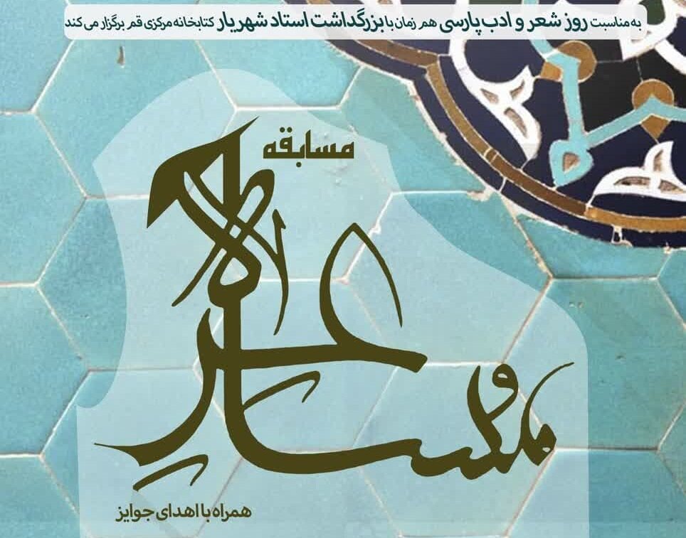 به گزارش روابط عمومی اداره کل کتابخانه های عمومی استان قم، به مناسبت روز بزرگداشت شعر و ادب پارسی و بزرگداشت استاد شهریار، مسابقه مشاعره ویژه نوجوانان با حضور و داوری راضیه جبه داری، شاعر، روز دوشنبه ۲۷ شهریور، ساعت ۱۷ در محل سالن جلسات کتابخانه مرکزی قم برگزار می‌شود.