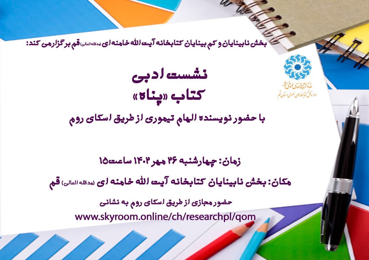 به گزارش روابط عمومی اداره کل کتابخانه های عمومی استان قم، به مناسبت روز جهانی عصای سفید نشست نقد و بررسی کتاب «پناه» با حضور الهام تیموری، نویسنده کتاب و جمعی از روشندلان عضو کتابخانه عمومی آیت الله خامنه‌ای به صورت مجازی و در بستر اسکای روم برگزار می شود.
