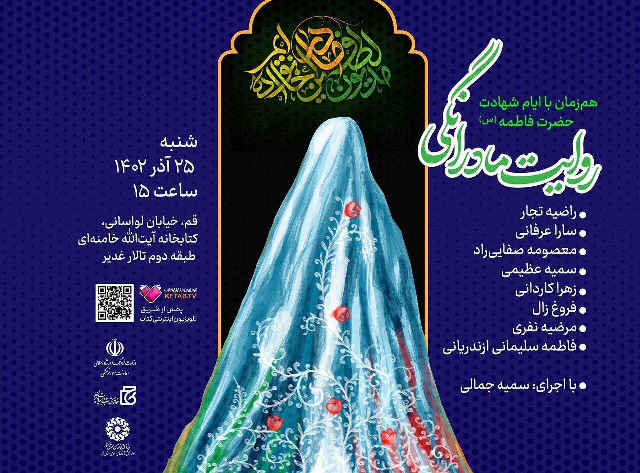 به گزارش روابط عمومی اداره‌کل کتابخانه‌های عمومی استان قم، همزمان با ایام شهادت حضرت فاطمه(س) محفل ادبی «روایت مادرانگی» از ساعت ۱۵ شنبه (بیست‌وپنجم آذر ۱۴۰۲) در کتابخانه عمومی آیت‌الله خامنه‌ای (مد ظله العالی) شهر قم برگزار می‌شود.