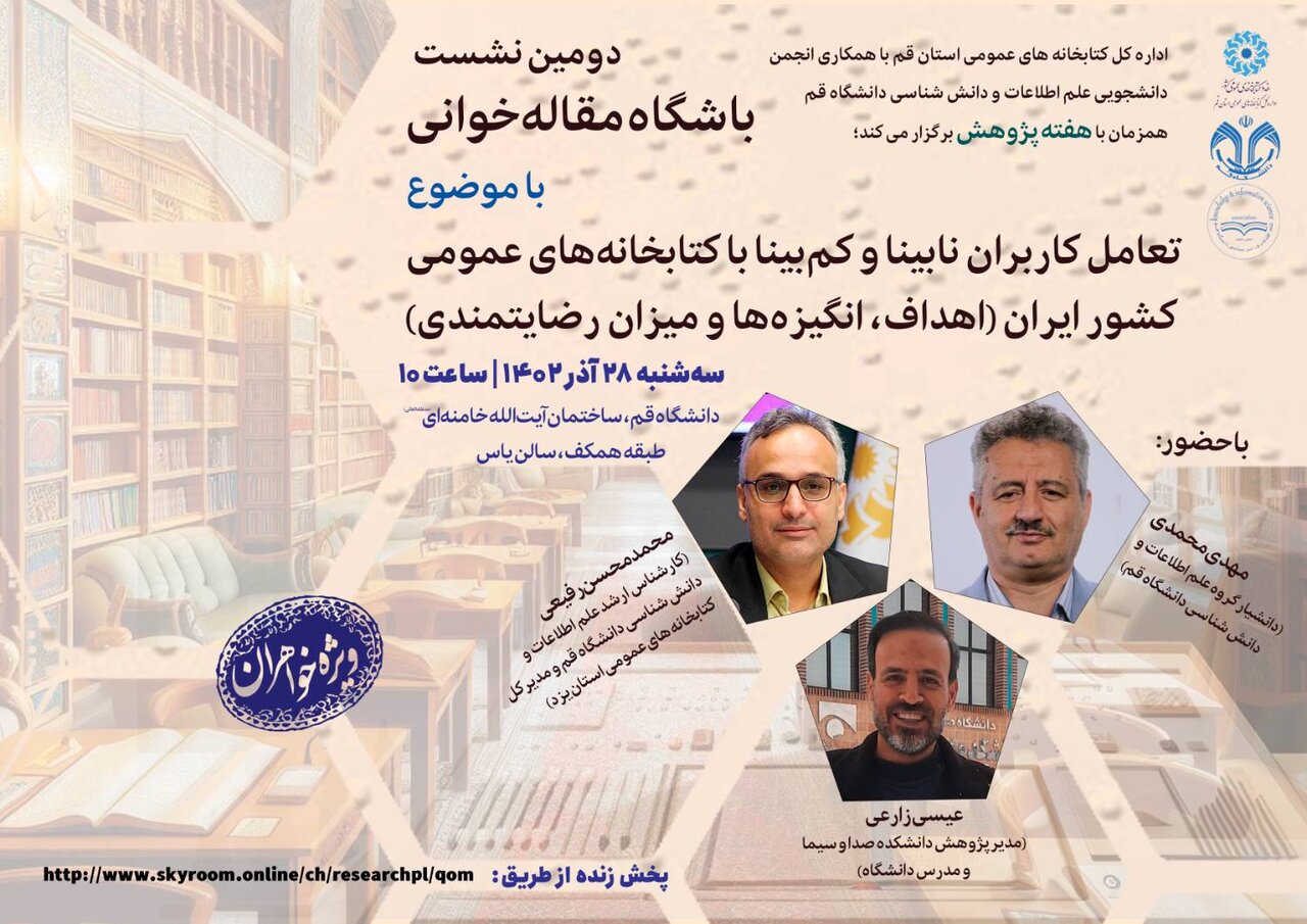 این نشست با محوریت مقاله حاصل از پایان نامه ای با عنوان «تعامل کاربران نابینا و کم بینا با کتابخانه های عمومی ایران؛ اهداف، انگیزه ها و میزان رضایت مندی» منتشر شده در شماره ۴ دوره ۲۸ فصلنامه تحقیقات اطلاع رسانی و کتابخانه های عمومی، با حضور جمعی از کتابداران، دانشجویان علم اطلاعات و دانش شناسی و کتابداران بخش نابینایان برگزار خواهد شد.