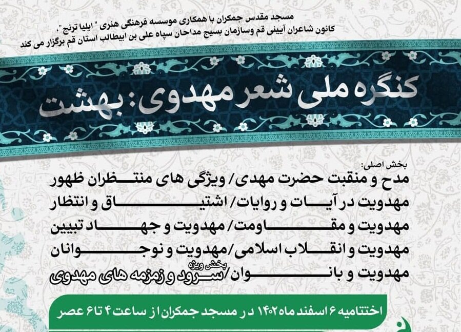 به گزارش روابط عمومی اداره کل کتابخانه های عمومی استان قم، مراسم اختتامیه کنگره ملی شعر مهدوی بهشت به همت مسجد مقدس جمکران و با همکاری موسسه فرهنگی هنری ایلیا ترنج،کانون شاعران آیینی قم، سازمان بسیج مداحان سپاه علی بن ابیطالب علیه السلام قم و با مشارکت محافل ادبی نهاد کتابخانه های عمومی کشور، 6 اسفند ماه ۱۴۰۲ همزمان با میلاد حضرت مهدی (عج) از ساعت ۴ تا ۶ عصر در مسجد مقدس جمکران همراه با شعرخوانی شاعران برگزیده و مهمانان ویژه برگزار خواهد شد.