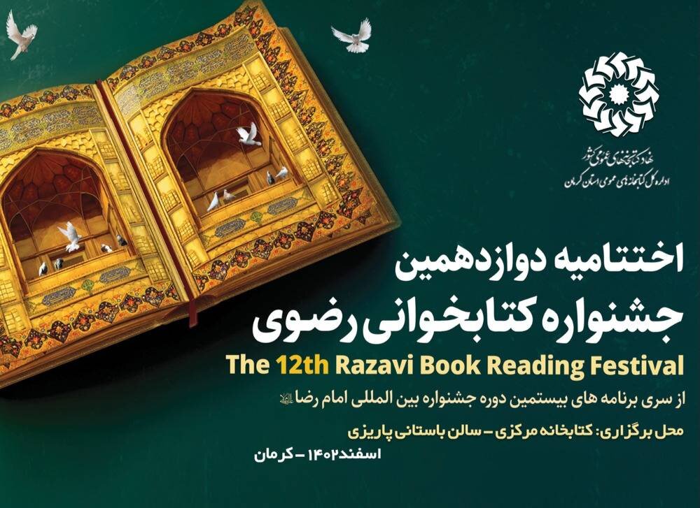 مراسم اختتامیه و تجلیل از برگزیدگان استانی دوازدهمین جشنواره کتابخوانی رضوی با حضور مسئولین استانی و برگزیدگان این دوره از جشنواره، ۱۵ اسفند ماه 1402 در سالن باستانی پاریزی کتابخانه مرکزی کرمان برگزار می شود.