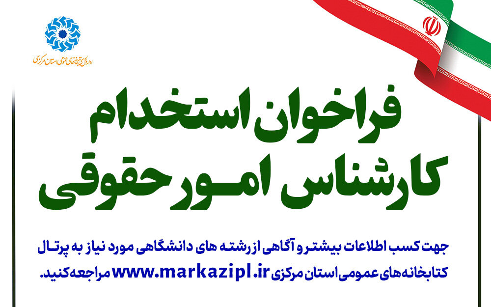 به گزارش روابط عمومی اداره کل کتابخانه‌های عمومی استان مرکزی، این اداره کل برای تکمیل نیروی انسانی (یک نفر) در رشته شغلی کارشناس حقوق از طریق گزینش و مصاحبه، از بین افراد واجد شرایط ذیل، در چارچوب قرارداد ساعتی دعوت به همکاری می کند.