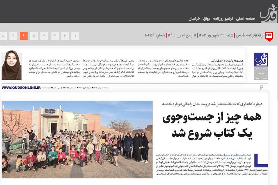 به گزارش روابط عمومی اداره کل کتابخانه های عمومی خراسان رضوی، روزنامه قدس در تاریخ ۲۴شهریورماه ۱۴۰۳ در مصاحبه با زینب ابویسانی از حال و هوای این روزهای کتابخانه عمومی شهدای ابویسان در شهرستان جغتای گفت. متن این مصاحبه در ادامه آمده است: