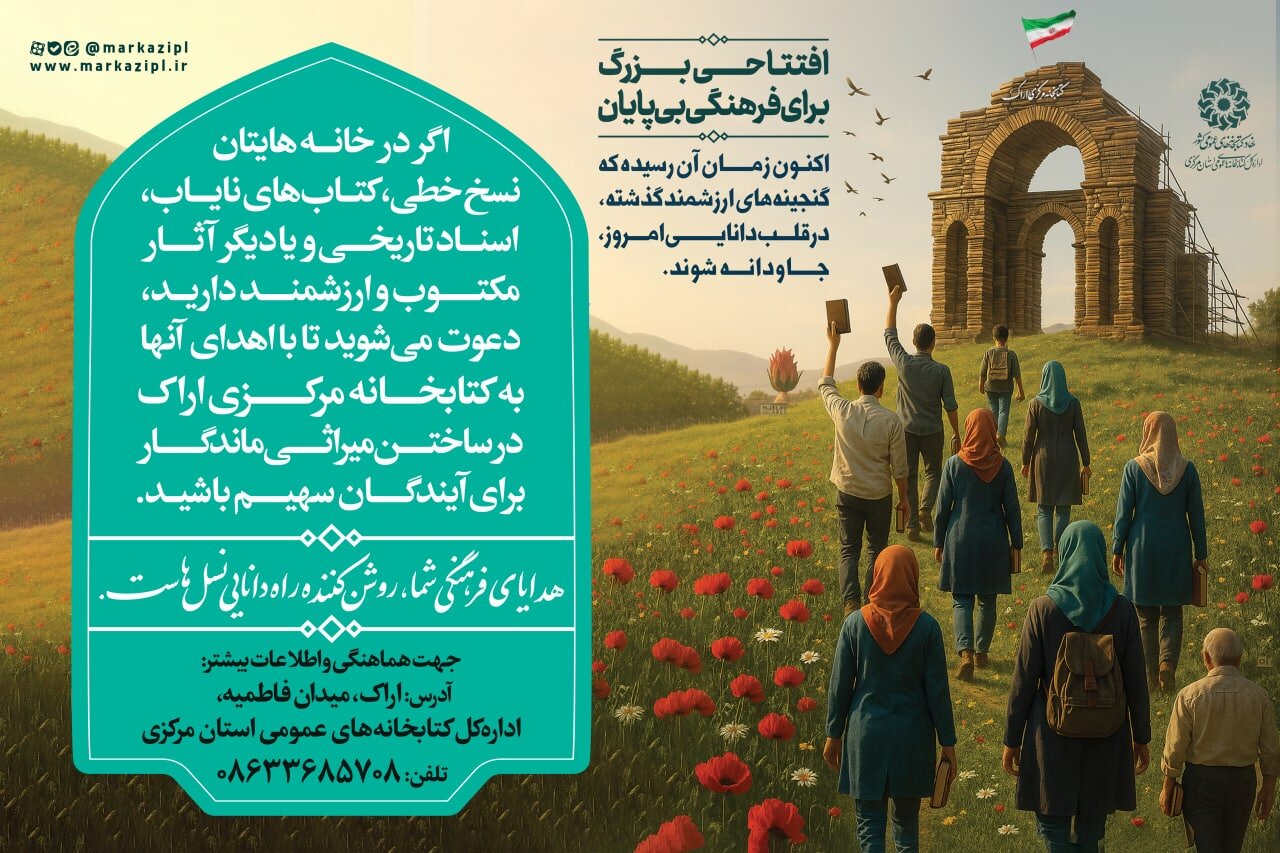 گودرزیزاده با اشاره به اهمیت مشارکت مردمی در شکلگیری هویت این مجموعه فرهنگی، گفت: در همین راستا، اداره کل کتابخانههای عمومی استان مرکزی از همه علاقهمندان به فرهنگ، تاریخ و میراث مکتوب ایران اسلامی دعوت میکند تا در تکمیل گنجینه منابع کتابخانه مرکزی اراک سهیم شوند. نسخ خطی، کتابهای نایاب، اسناد تاریخی، عکسهای ارزشمند و آثار مکتوب خانوادگی میتوانند با نام اهداکنندگان، بخشی از حافظه ماندگار فرهنگی استان شوند.