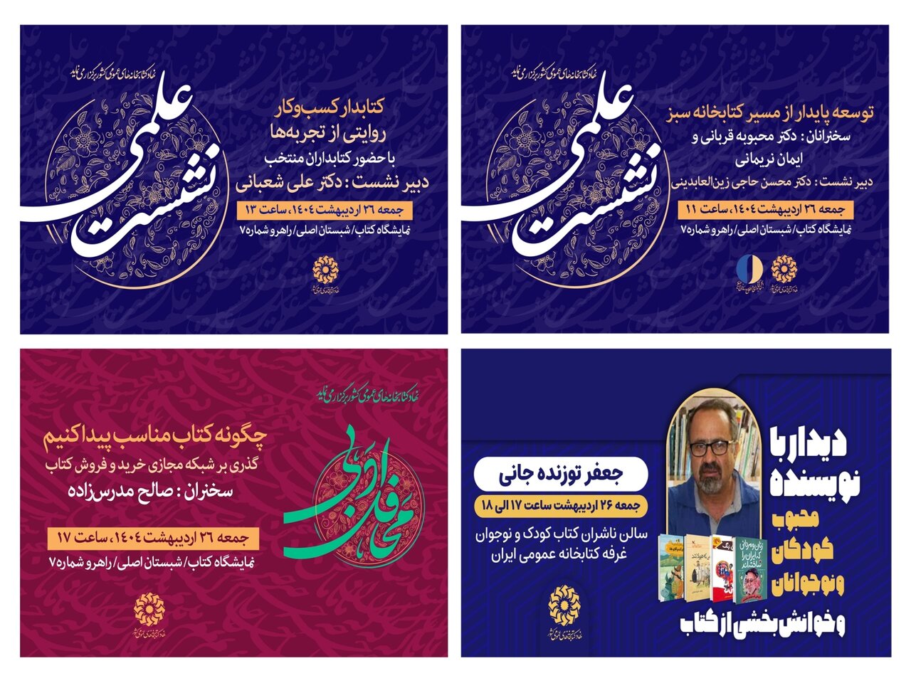 به گزارش پایگاه اطلاع‌رسانی نهاد کتابخانه‌های عمومی کشور، جمعه ۲۶ اردیبهشت‌ماه همزمان با دهمین روز از سی‌وششمین نمایشگاه بین‌المللی کتاب تهران، سه نشست تخصصی  در غرفه اصلی نهاد کتابخانه‌های عمومی کشور، واقع در راهروی ۷ سالن شبستان، برگزار می‌شود.