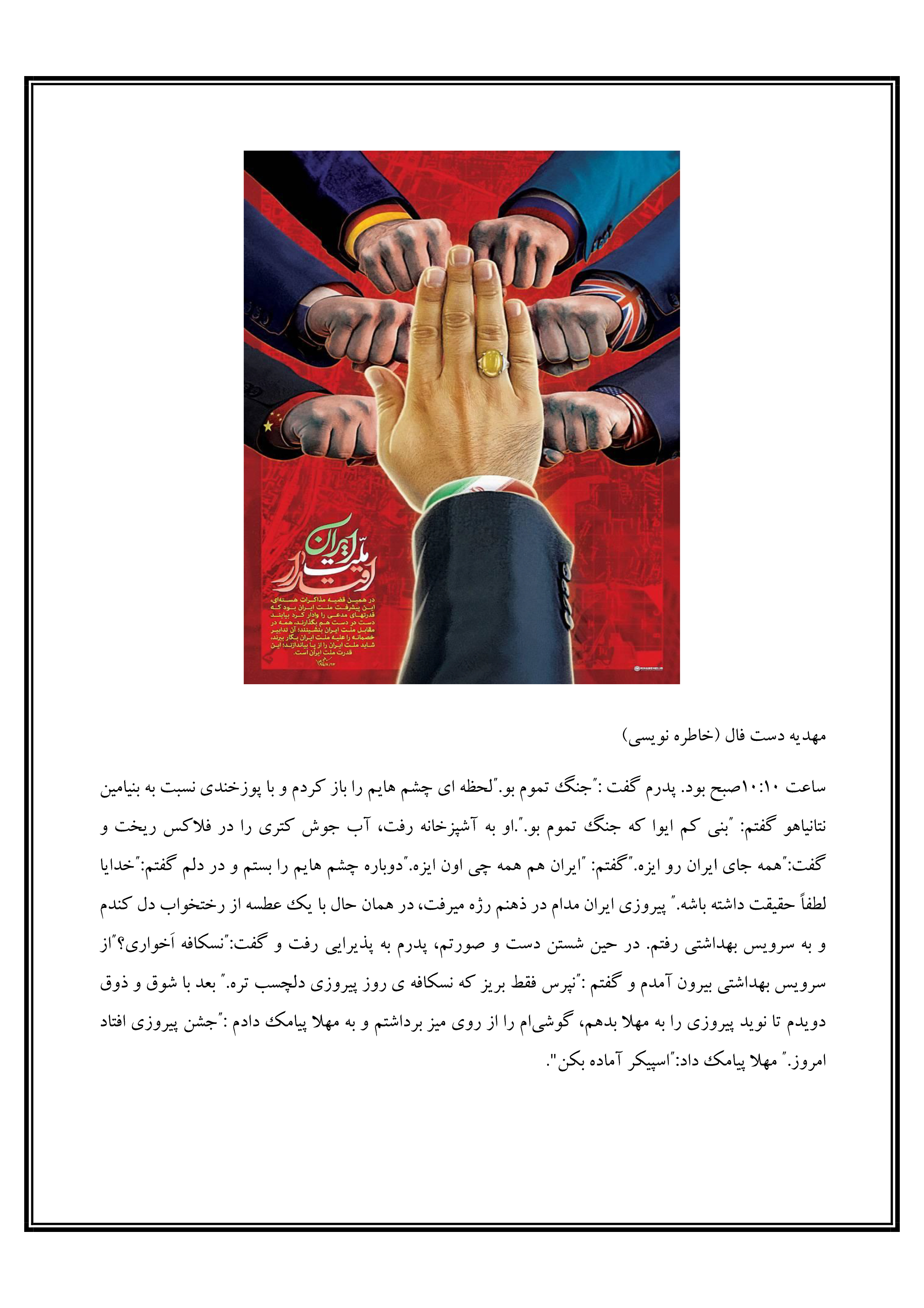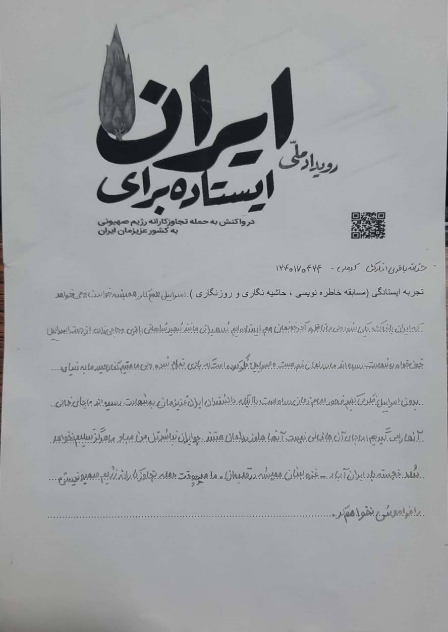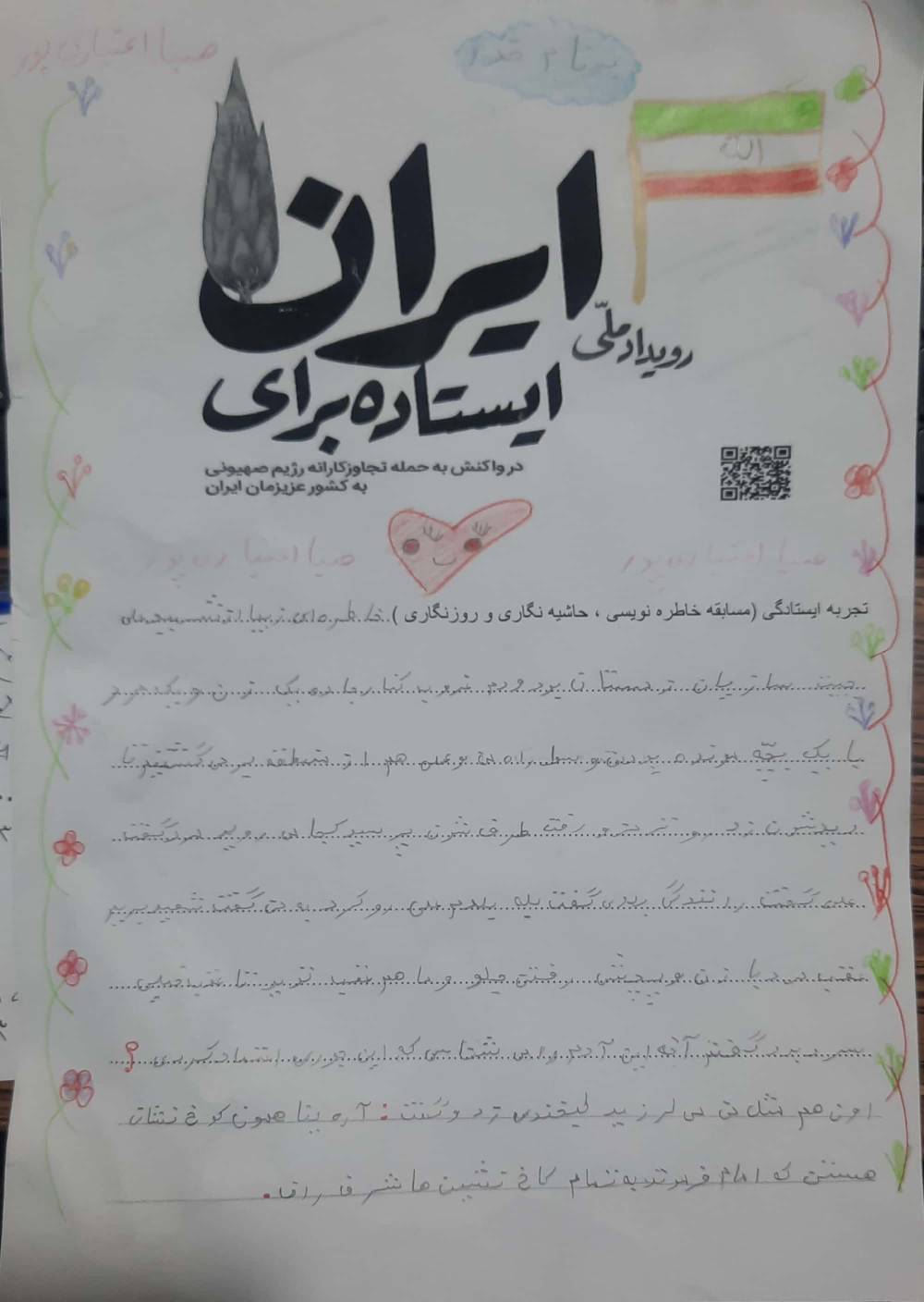 برگزاری مسابقه خاطرهنویسی، حاشیهنگاری و روزنگاری با موضاعات پویش و انتشار آثار با هشتک #تجربهــایستادگی آثار خود را به شماره ۰۹۱۰۵۰۳۹۳۲۰ در پیام رسان بله یا ایتا ارسال فرمایید. دقت فرمایید که فایل شما باید با فرمت word یا pdf بوده و حجم مطلب نباید از یک صفحه A۴ بیشتر باشد.