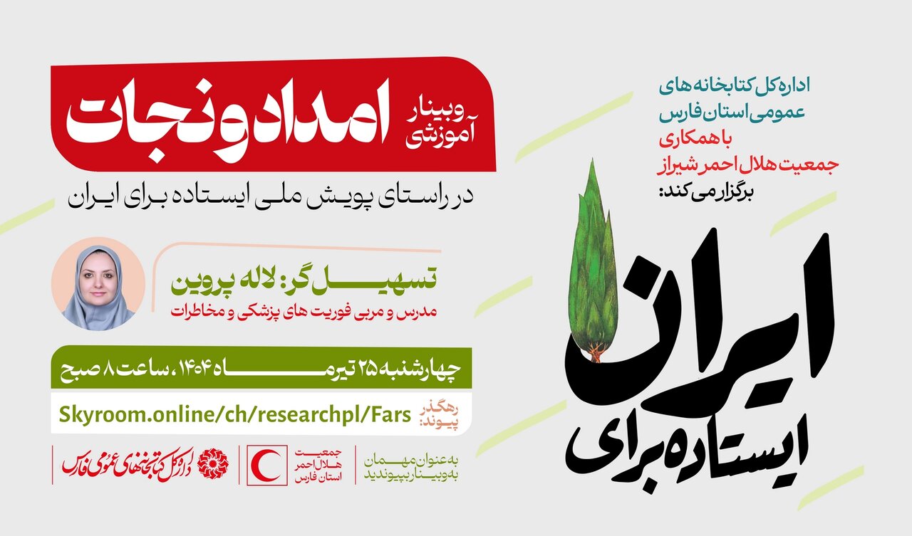 به گزارش روابط عمومی ادارهکل کتابخانههای عمومی استان فارس، وبینار آموزشی «امداد و نجات» در راستای پویش ملی «ایستاده برای ایران»، ویژه کتابداران و اعضای کتابخانههای عمومی استان فارس اجرا میشود.