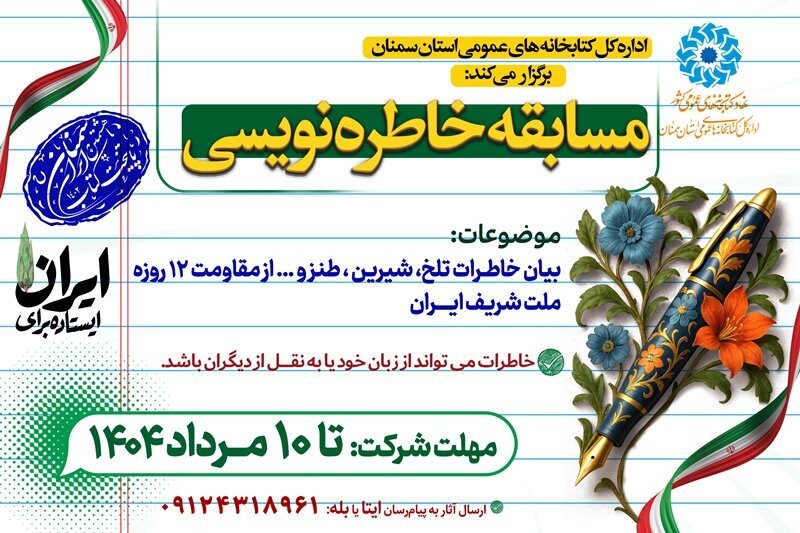 به همت اداره کل کتابخانه‌های عمومی استان سمنان در قالب رویداد ملی «ایستاده برای ایران»، مسابقه «خاطره‌نویسی» باهدف ایجاد انگیزه برای مخاطبان در نگارش متن و نویسندگی و در موضوعات خاطرات تلخ و شیرین، طنز و ... از مقاومت ۱۲ روزه ملت شریف ایران مقابل اسرائیل قاصب و استکبار جهانی، روایت ایران همدل و دیگر موضوعات مرتبط با تهاجم رژیم جعلی اسرائیل به ایران برگزار می‌شود.