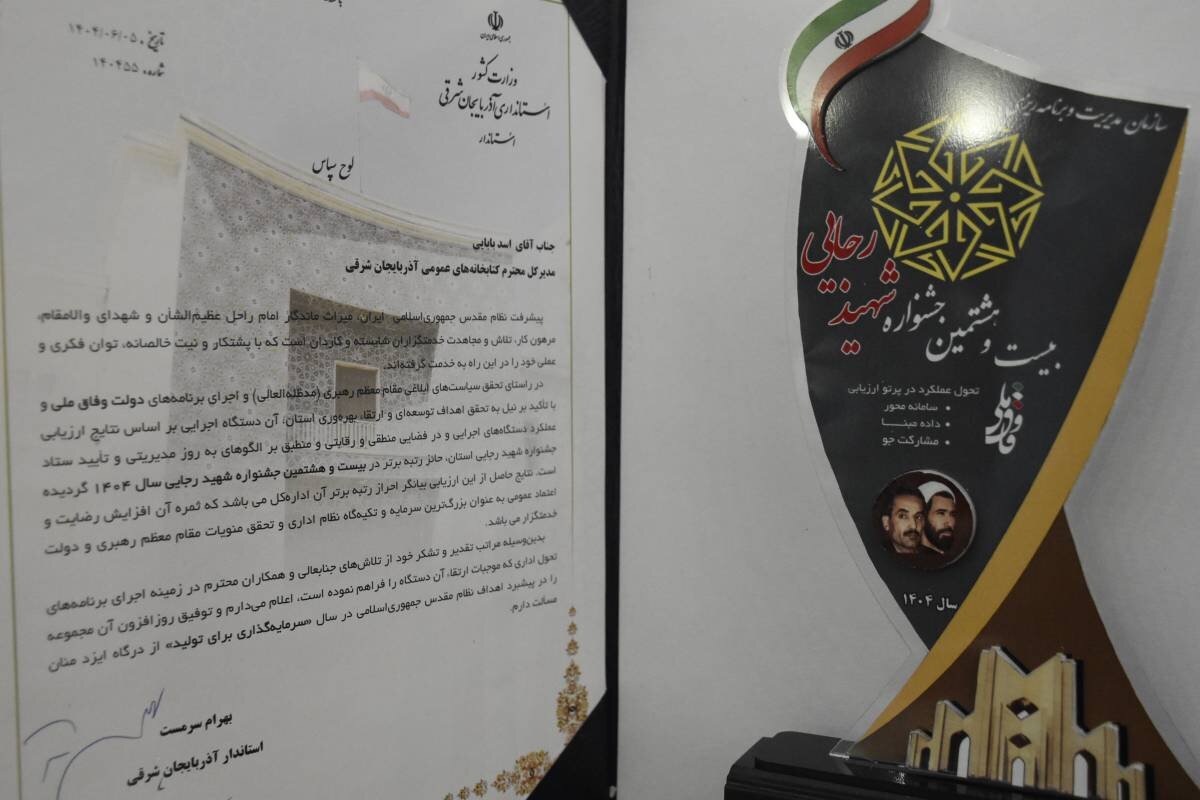 همزمان با برگزاری جشنواره شهید رجایی در سال ۱۴۰۴، اداره کل کتابخانه‌های عمومی استان آذربایجان‌شرقی، در بخش جوایز موضوعی، حائز رتبه برتر شد.