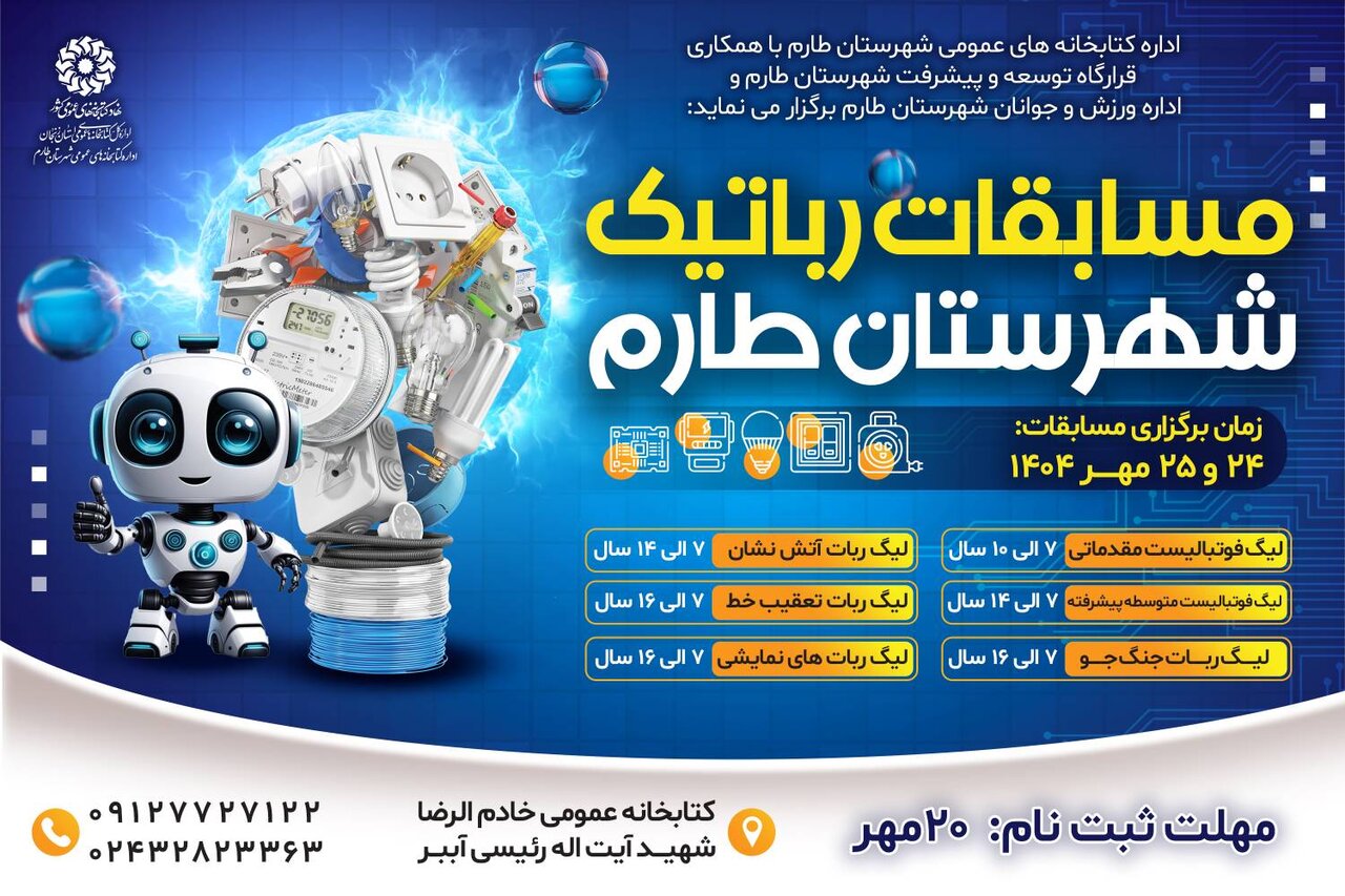 به گزارش روابط عمومی اداره‌کل کتابخانه‌های عمومی استان زنجان، مسابقات رباتیک شهرستان طارم با هدف ارزیابی سطح آمادگی هنرجویان کلاس‌های رباتیک و ایجاد انگیزه بیشتر برای پیشرفت علمی و عملی کودکان و نوجوانان، روزهای ۲۴ و ۲۵ مهرماه سال جاری در محل کتابخانه عمومی خادم‌الرضا(ع)، شهید آیت‌الله رئیسی شهر آب‌بر برگزار خواهد شد.