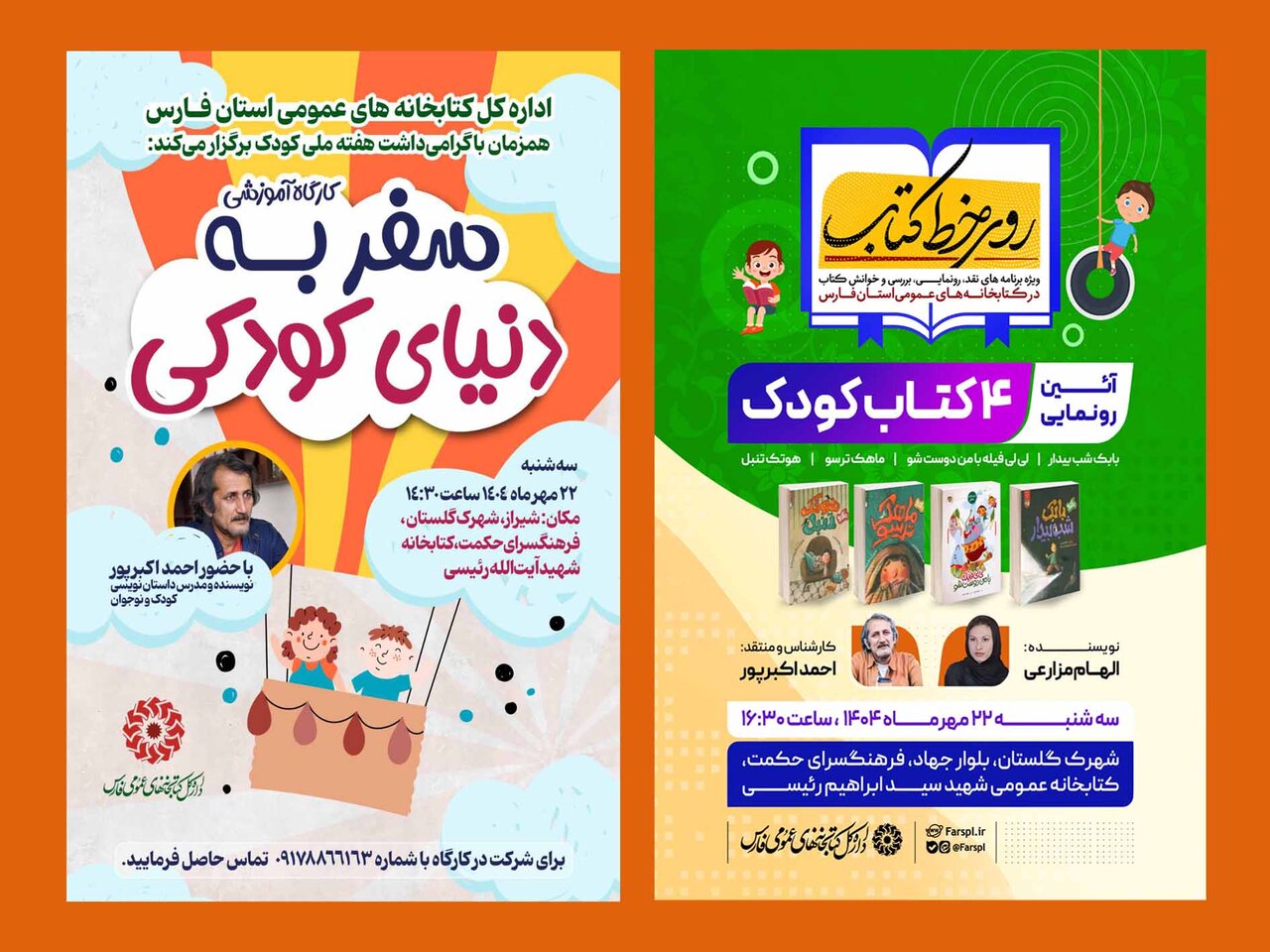 اداره‌کل کتابخانه‌های عمومی استان فارس به مناسبت هفته ملی کودک، کارگاه آموزشی «سفر به دنیای کودکی» و آیین رونمایی از چهار کتاب کودک، نوشته الهام مزارعی را برگزار می‌کند.