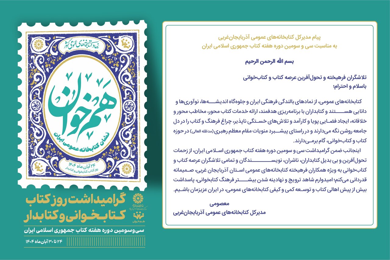 اینجانب، ضمن گرامیداشت سی و سومین دوره هفته کتاب جمهوری اسلامی ایران، از زحمات تحولآفرین و بیبدیل کتابداران، ناشران، نویسندگان و تمامی تلاشگران عرصه کتاب و کتابخوانی به ویژه همکاران فرهیخته کتابخانههای عمومی استان آذربایجان غربی، صمیمانه قدردانی میکنم؛ امیدوارم شاهد ترویج و نهادینهشدن بیشتر فرهنگ کتابخوانی، پاسداشت بیش از پیش اهالی کتاب و توسعه کمی و کیفی کتابخانههای عمومی، در ایران عزیزمان باشیم.