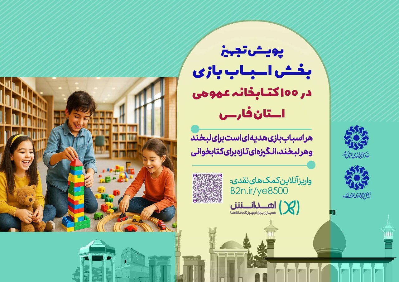 وی اضافه کرد: همزمان با هفته کتاب و در آیین بزرگداشت روز کتاب، کتابخوانی و کتابدار با حضور استاندار فارس، پویش تجهیز ۱۰۰ کتابخانه عمومی استان به بخش اسباببازی با محوریت سایت اهدانش و با شعار همراهی برای تجهیز کتابخانهها آغاز شد، امیدواریم با کمک خیرین این رویداد انجام شود.