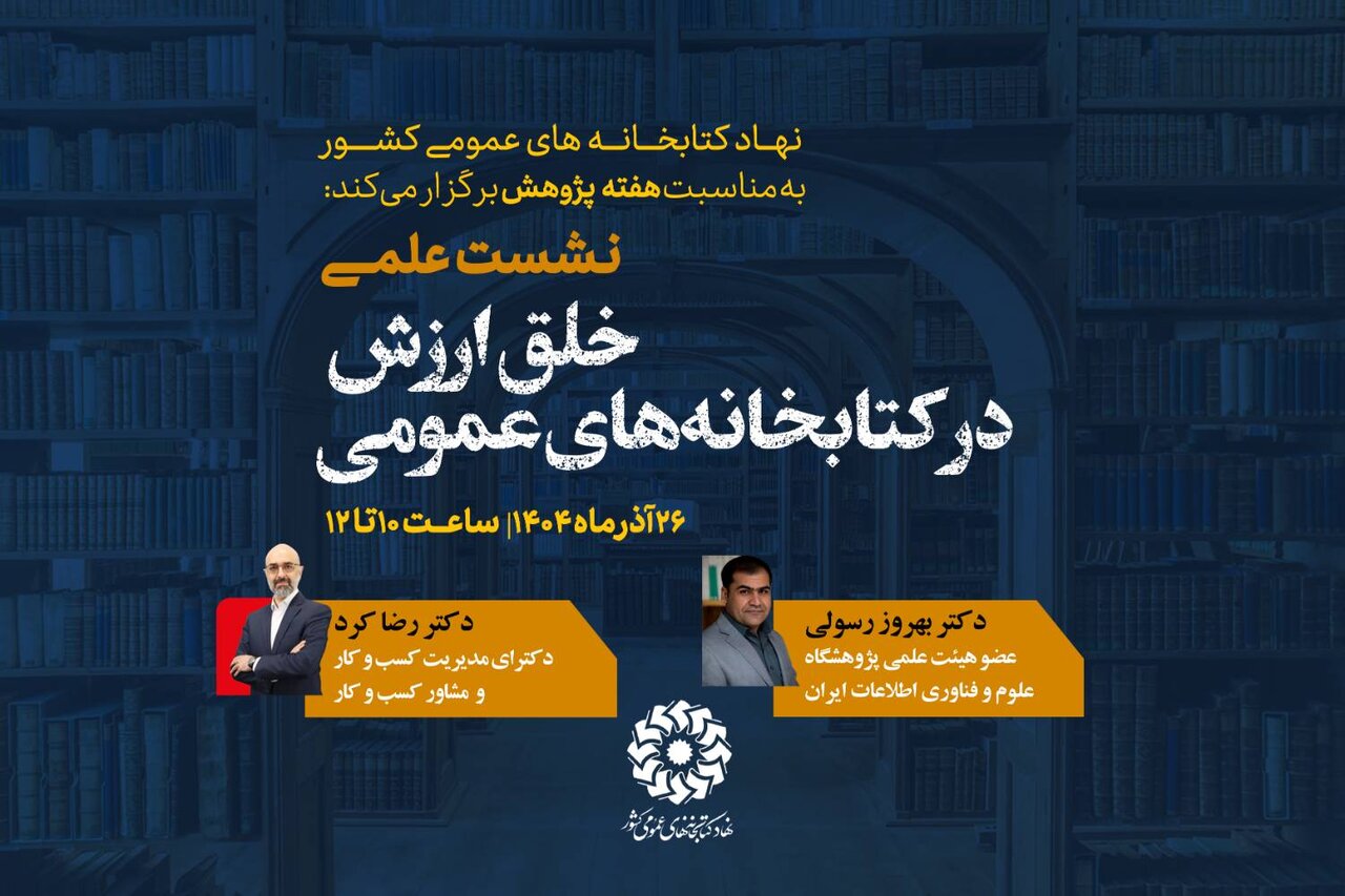 به گزارش اداره‌کل روابط عمومی و امور بین‌الملل نهاد کتابخانه‌های عمومی کشور، نشست علمی «خلق ارزش در کتابخانه‌های عمومی»، چهارشنبه ۲۶ آذر ۱۴۰۴، همزمان با هفته پژوهش، با سخنرانی بهروز رسولی؛ هیئت علمی پژوهشگاه علوم و فناوری اطلاعات ایران و رضا کرد؛ مشاور کسب‌وکار، در سالن جلسات ستاد مرکزی نهاد، برگزار خواهد شد.