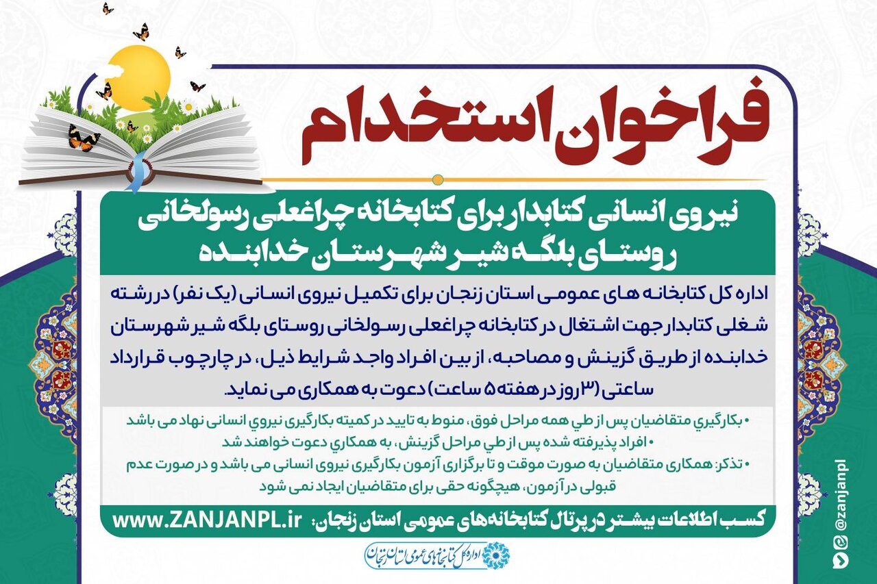 به گزارش روابط عمومی اداره‌کل کتابخانه‌های عمومی استان زنجان، اداره‌کل کتابخانه‌های عمومی استان زنجان برای تکمیل نیروی انسانی کتابخانه ولایت روستای خیرآباد (۱ نفر)  در رشته شغلی کتابدار جهت اشتغال در کتابخانه چراغعلی رسولخانی روستای بلگه شیر شهرستان خدابنده از طریق گزینش و مصاحبه، از بین افراد واجد شرایط ذیل، در چارچوب قرارداد ساعتی (۳ روز در هفته ۵ ساعت) دعوت به همکاری می کند.