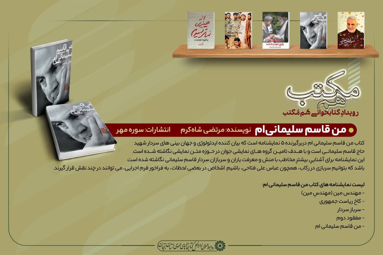 به گزارش روابط عمومی ادارهکل کتابخانههای عمومی استان زنجان، در سالروز شهادت سردار سپهبد شهید حاج قاسم سلیمانی، کتاب «من قاسم سلیمانیام» که شامل ۵ نمایشنامه است و بر اساس ایدئولوژی و جهانبینی سردار شهید سلیمانی نگاشته شده است، به کتابخوانان استان زنجان معرفی شد.