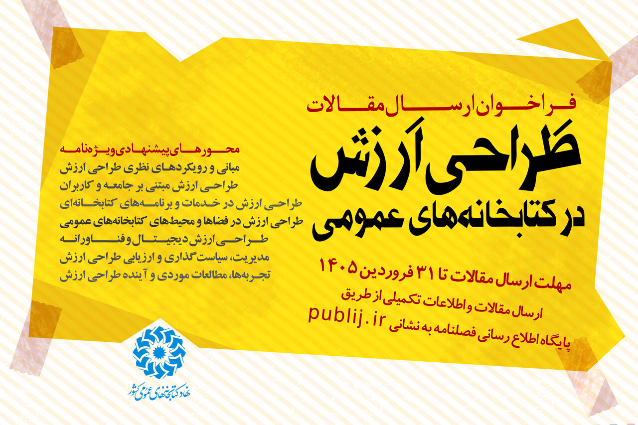 مبانی و رویکردهای نظری طراحی ارزش شامل: مفهوم و ابعاد ارزش در کتابخانه‌های عمومی؛ طراحی ارزش، ارزش عمومی و ارزش اجتماعی؛ نسبت طراحی ارزش با طراحی خدمت و نوآوری خدمات - طراحی ارزش مبتنی بر جامعه و کاربران، شامل: ذی‌نفع‌محوری و مشارکت جامعه محلی؛ هم‌آفرینی ارزش با کاربران کتابخانه؛ تجربه کاربر و نقش آن در خلق ارزش - طراحی ارزش در خدمات و برنامه‌های کتابخانه‌ای، شامل: طراحی ارزش در خدمات اطلاعاتی و مرجع؛ ارزش‌آفرینی در برنامه‌های فرهنگی، ترویجی و اجتماعی؛ طراحی ارزش برای گروه‌های خاص و کمتر برخوردار - طراحی ارزش در فضاها و محیط‌های کتابخانه‌های عمومی، شامل: ارزش‌آفرینی از طریق فضاهای فیزیکی کتابخانه؛ نقش کتابخانه به‌عنوان فضای سوم؛ طراحی فضاهای یادگیری، مشارکتی و خلاق _ طراحی ارزش دیجیتال و فناورانه، شامل: طراحی ارزش در خدمات دیجیتال و هوشمند؛ نقش فناوری‌های نوین در خلق ارزش عمومی؛ چالش‌ها و ملاحظات اخلاقی طراحی ارزش فناورانه _ مدیریت، سیاست‌گذاری و ارزیابی طراحی ارزش، شامل: نقش مدیریت و رهبری در طراحی ارزش؛ سیاست‌گذاری ارزش‌محور در کتابخانه‌های عمومی؛ سنجش و ارزیابی ارزش اجتماعی و فرهنگی کتابخانه‌ها _  تجربه‌ها، مطالعات موردی و آینده طراحی ارزش، شامل: مطالعات موردی داخلی و بین‌المللی؛ تجربه‌های نوآورانه کتابخانه‌های عمومی ایران؛ روندها و چشم‌اندازهای آینده طراحی ارزش، محورهای پیشنهادی اداره‌کل پژوهش و آموزش نهاد به پژوهشگران و محققان برای تألیف و ارسال مقاله (پیرامون یک یا چند محور)، برای انتشار در این ویژه‌نامه است.