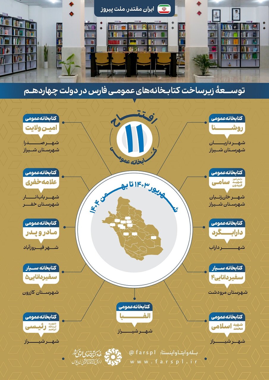 به گزارش روابط عمومی اداره کل کتابخانه‌های عمومی فارس، در حاصل تلاش‌ها و اقدامات دولت چهاردهم، از شهریور ۱۴۰۳ تا بهمن ۱۴۰۴، یازده باب کتابخانه عمومی نسل جدید با خدمات متنوع در استان فارس به بهره‌برداری رسید.