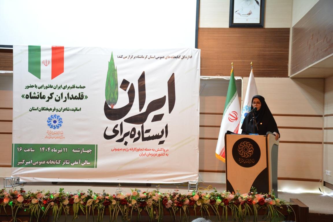 روز چهارشنبه ۱۱ تیرماه و در آستانه روز قلم و همزمان با ماه محرم، شاعران کرمانشاهی با گردهمایی در محفل شعر آیینی «ایستاده برای ایران»، با سرودن اشعاری حماسی و مذهبی، ضمن پاسداشت فرهنگ مقاومت، جنایات رژیم صهیونیستی را محکوم کردند. در این محفل، شاعران با سرودن اشعاری در سوگ اهلبیت(ع) و در محکومیت جنایات رژیم صهیونیستی، جلوهای از پیوند ادبیات آیینی و مقاومت را به نمایش گذاشتند. در پایان برنامه، از جمعی از شاعران و نویسندگان برجسته استان با اهدای لوح سپاس، تقدیر بهعمل آمد.