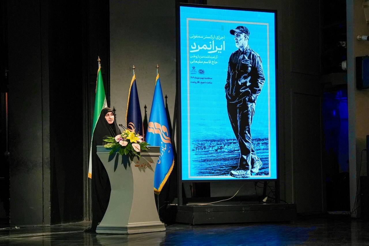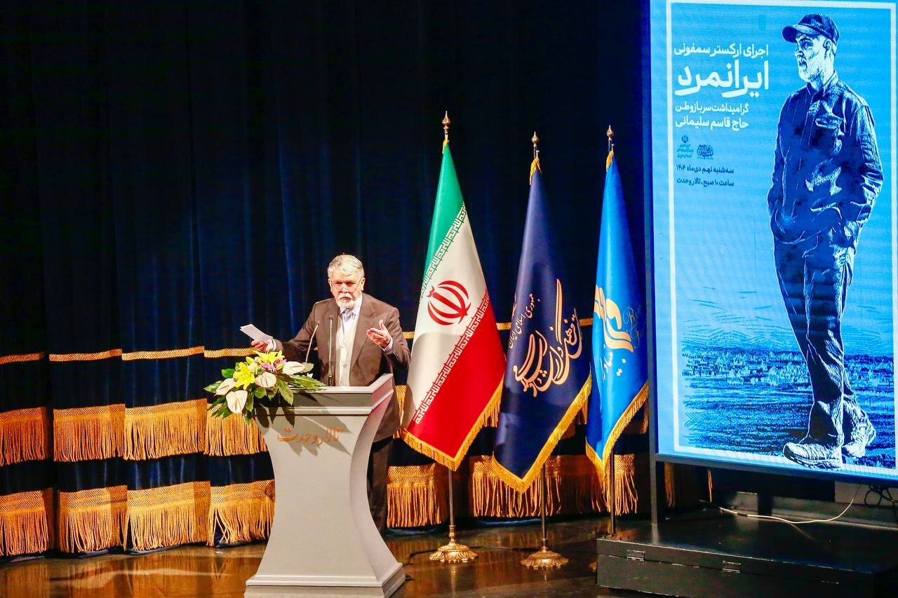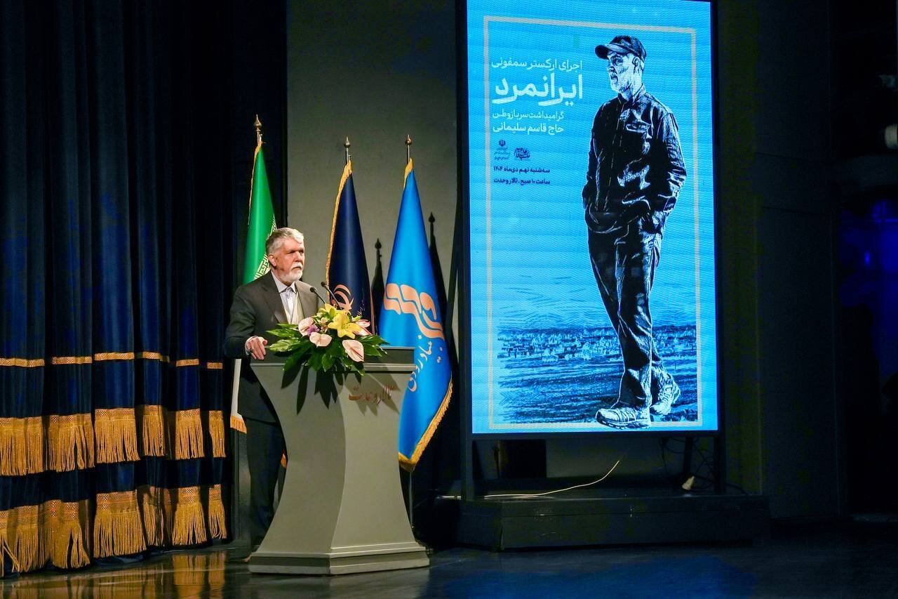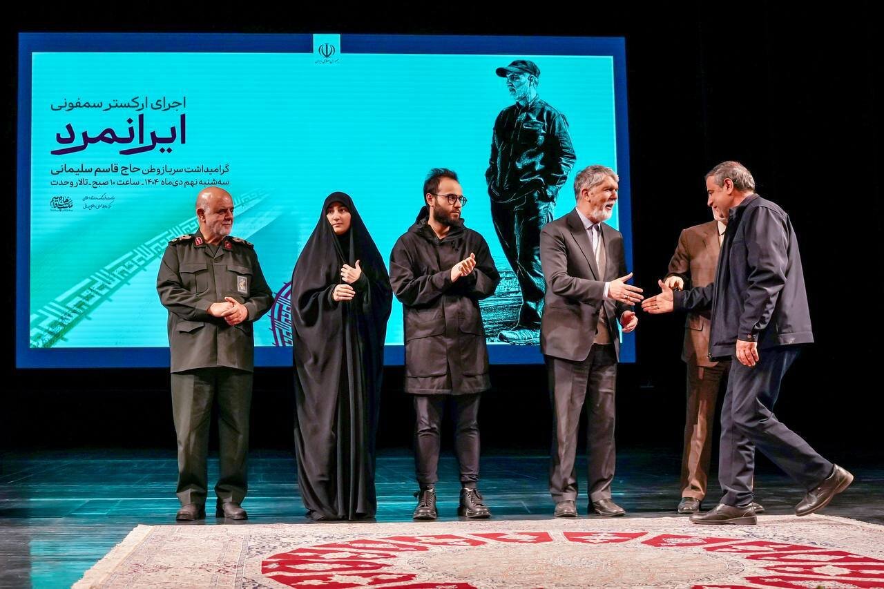 آیین اجرای ارکستر سمفونیک «ایرانمرد»، گرامیداشت یاد و خاطره سردار سرافراز شهید حاج قاسم سلیمانی، با رویکرد پاسداشت هویت ملی، ایثار و همبستگی فرهنگی، صبح امروز سه‌شنبه ۹ دی ۱۴۰۴، با حضور سید عباس صالحی؛ وزیر فرهنگ و ارشاد اسلامی، آزاده نظربلند؛ دبیرکل نهاد کتابخانه‌های عمومی کشور، زینب سلیمانی؛ فرزند سپهبد شهید حاج قاسم سلیمانی و جمعی از مسئولان و اهالی فرهنگ، در تالار وحدت برگزار شد.